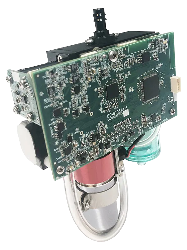The architecture of our Particle Counter allows it to measure up to 30 channels of particle count data from 0.3 to 25.0 μm with flow rates of 1.2 LPM or 2.83 LPM (0.1 CFM). The assembly is mounted on a plate for ease of integration.