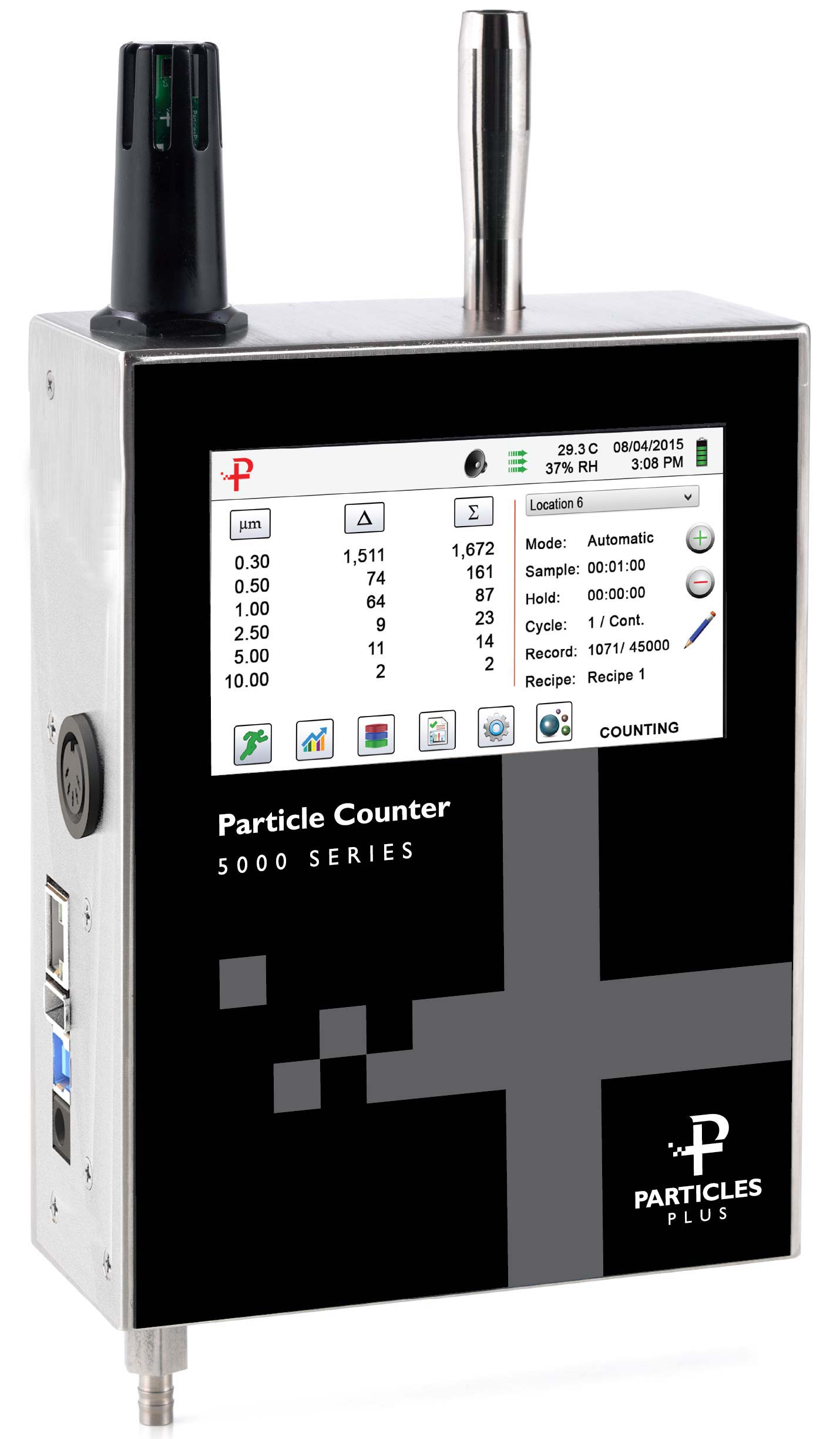 The Particles Plus® 5301 Remote Particle Counter measures particles from 0.3 to 25.0 μm at a flow rate of 0.1 CFM (2.83 LPM). These compact and user-friendly instruments display up to six selectable particle size channels, along with optional temperature and relative humidity sensors.