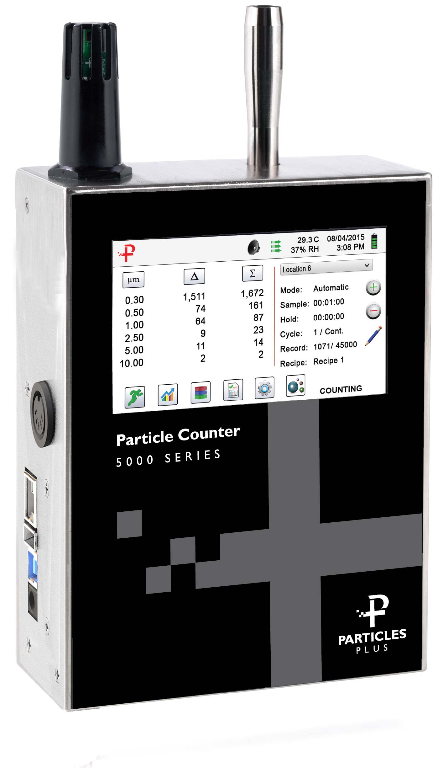 The Particles Plus® 5301P Remote Particle Counter measures particles from 0.3 to 25.0 μm at a flow rate of 0.1 CFM (2.83 LPM). These compact and user-friendly instruments display up to six selectable particle size channels, along with optional temperature and relative humidity sensors.